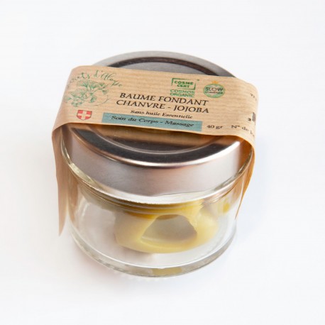 Baume de massage fondant formulé avec du beurre de Karité et les huiles végétales brut d'Avocat, Chanvre et Jojoba en forme de coeur. Ce baume à la propriété de fondre au contact de la peau et d'être très hydratants mais non gras.